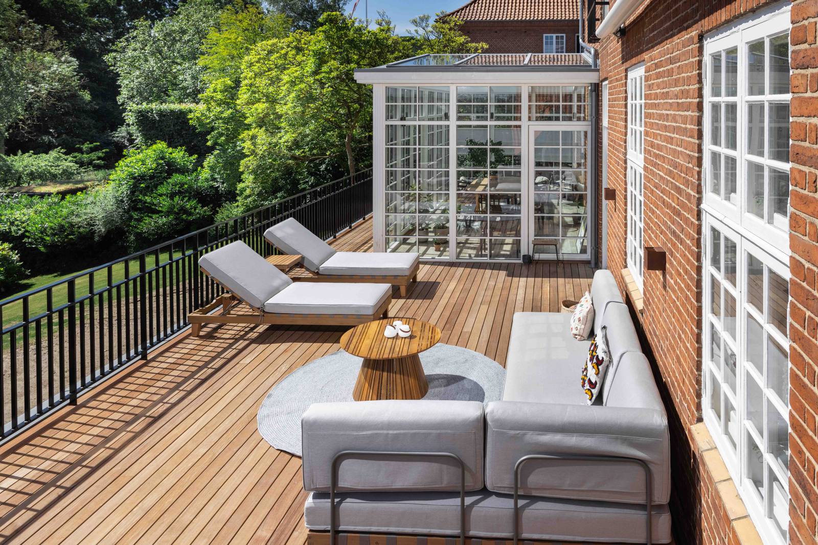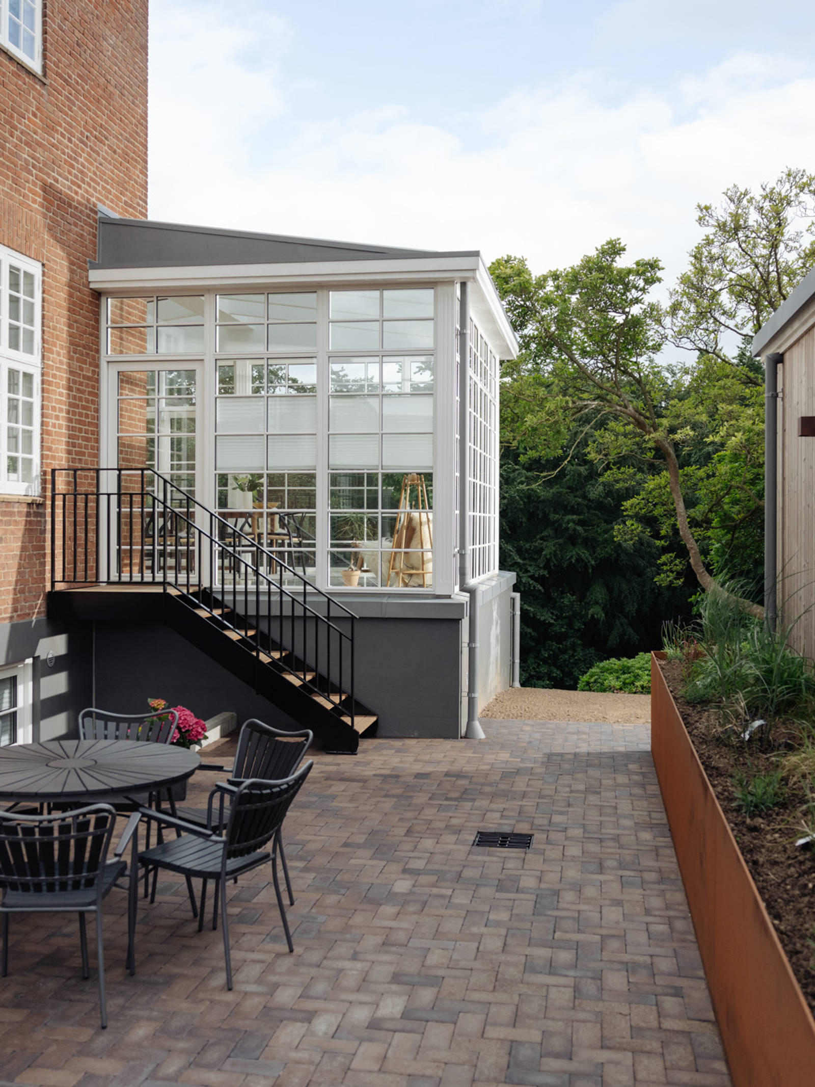 The kitchen offers direct access to both a large terrace and an orangery, allowing the family to enjoy the changing seasons to the full. The terrace leads down into the old part of the garden, a green oasis with a large and beautiful magnolia tree, old rhododendrons and a large laburnum tree.