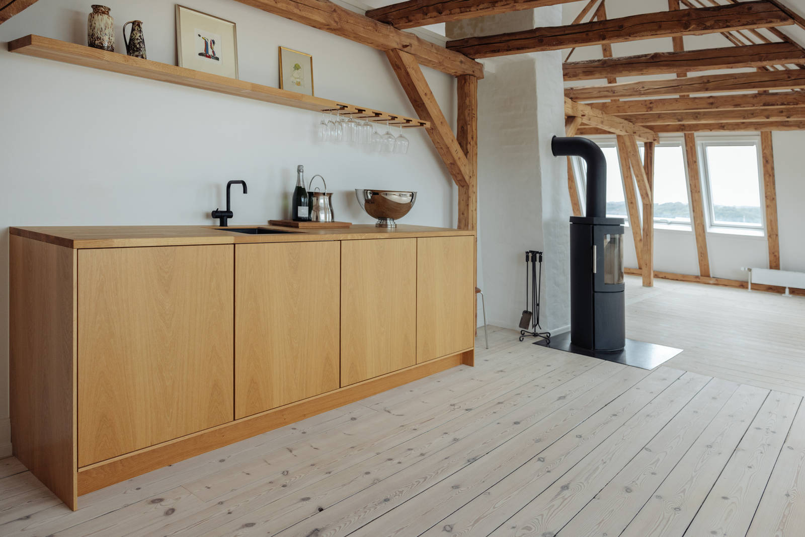 The space is furnished with an oak kitchenette from uno form’s Avantgarde collection with an oak shelf with integrated slots for hanging wineglasses.