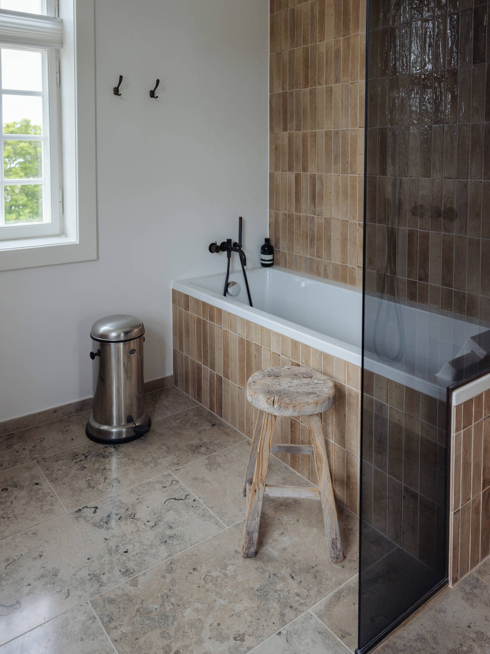 All four bathrooms in the house feature oak bathroom furniture from uno form’s Avantgarde collection, vola taps in burnished brass and tiles in shimmering shades of brown for a coherent look.