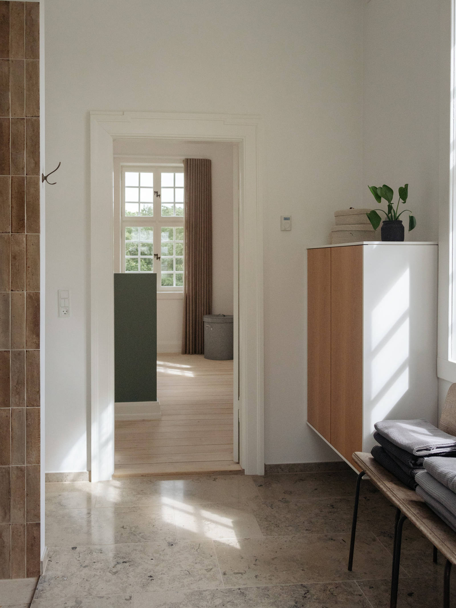 The master bedroom is located on the first floor. The double bed is placed in the middle of the room, from where Maria and Peter can enjoy views of the woods and the inlet Vejle Fjord. Adjoining it is a large bathroom, where Maria has combined modern bathroom furniture from uno form with old items that are steeped in character and soul. The old school bench is used for stacking towels, while a Chinese stool next to the bath is perfect as somewhere to leave your bathrobe.
