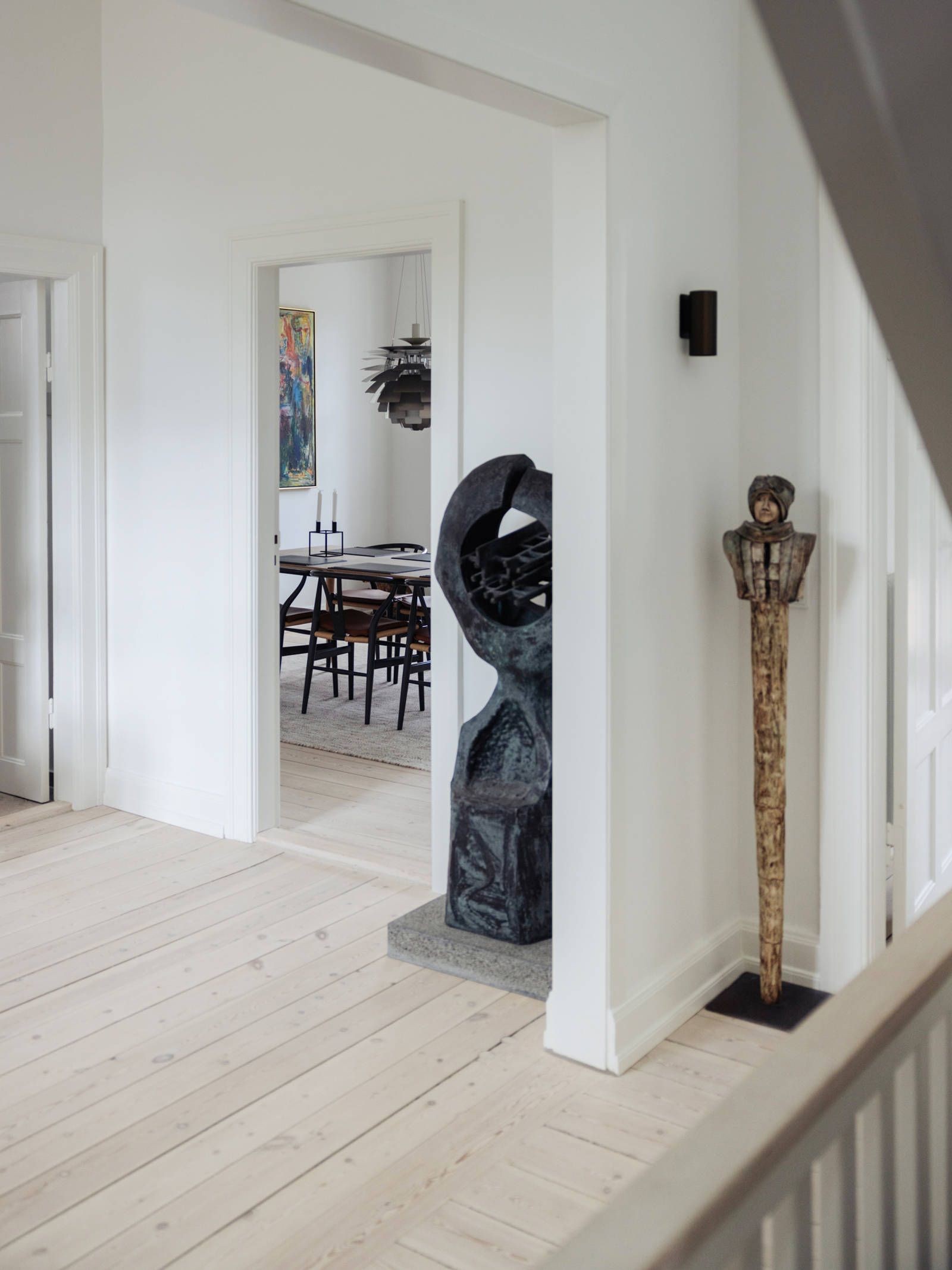 A painting by the Danish/Faroese artist Gunleif Grube which Maria inherited from her parents hangs on one of the kitchen walls. Maria’s father had a special passion for works by the artist, who was born in 1947 in Tórshavn, and Maria and Peter have several of his paintings. Throughout the house, Danish furniture classics are juxtaposed with twentieth-century art and sculptures as well as antiques, delightful street market finds and quirky mementos from both Maria’s and Peter’s childhood homes.