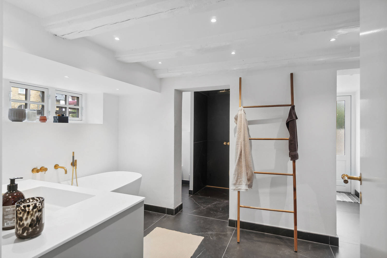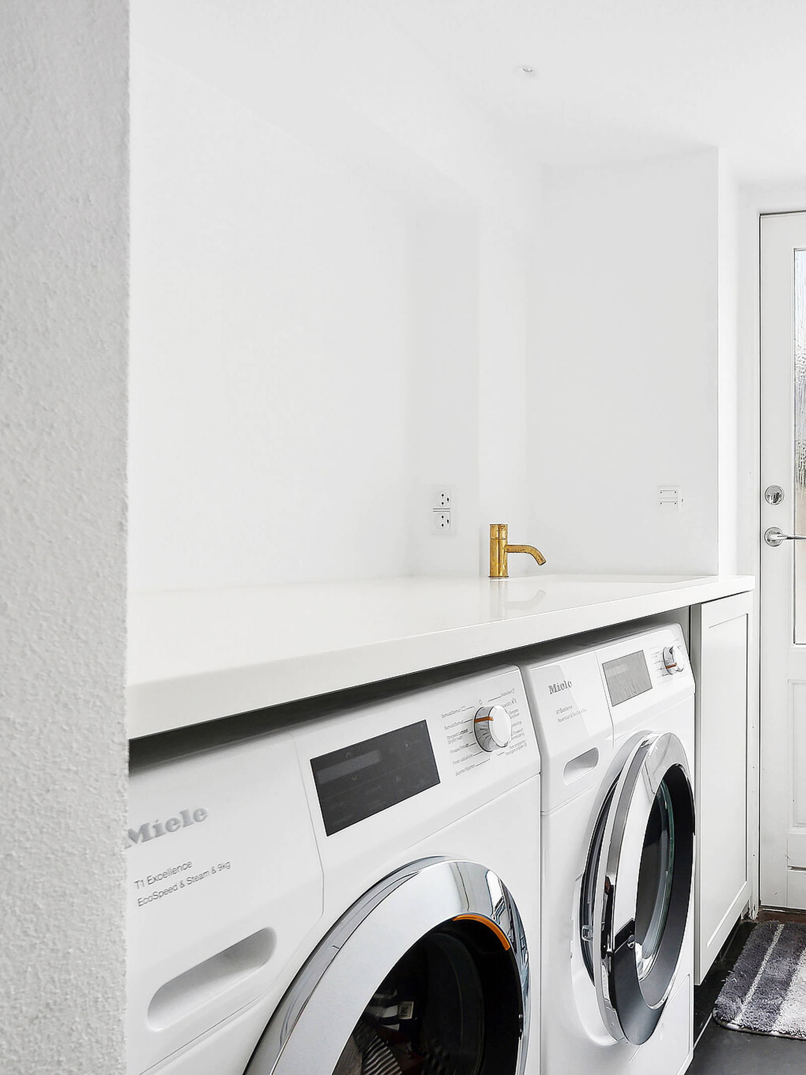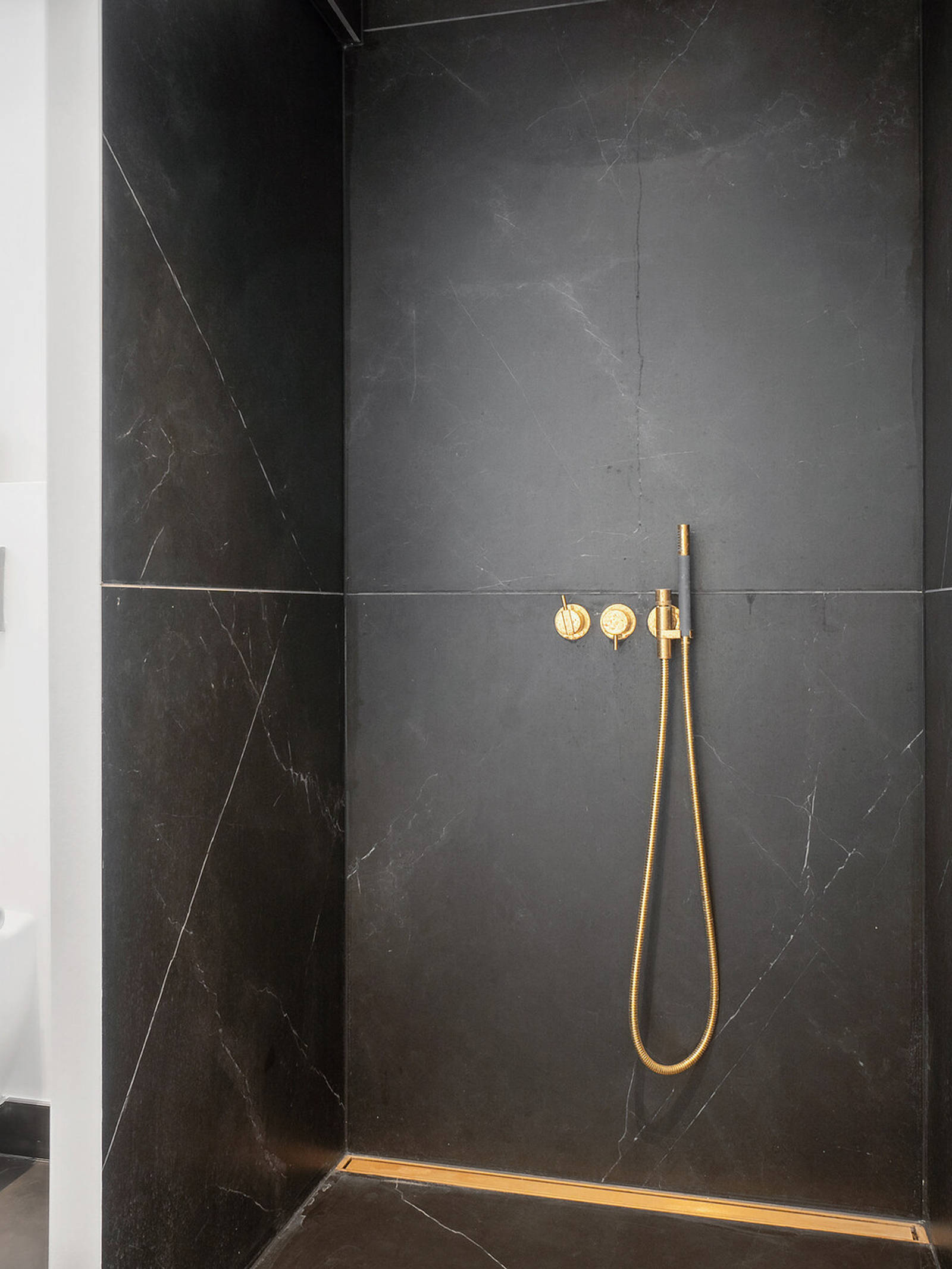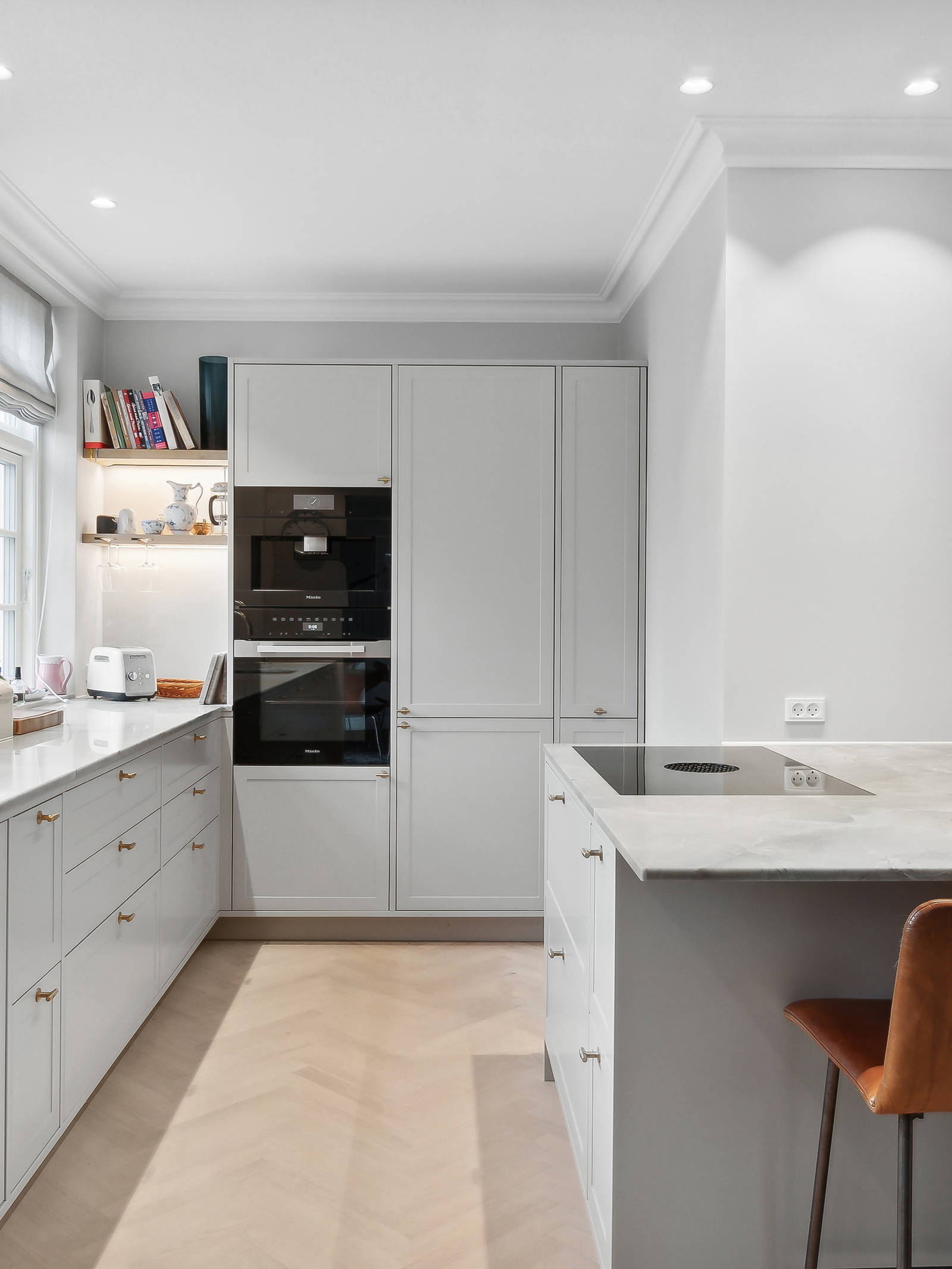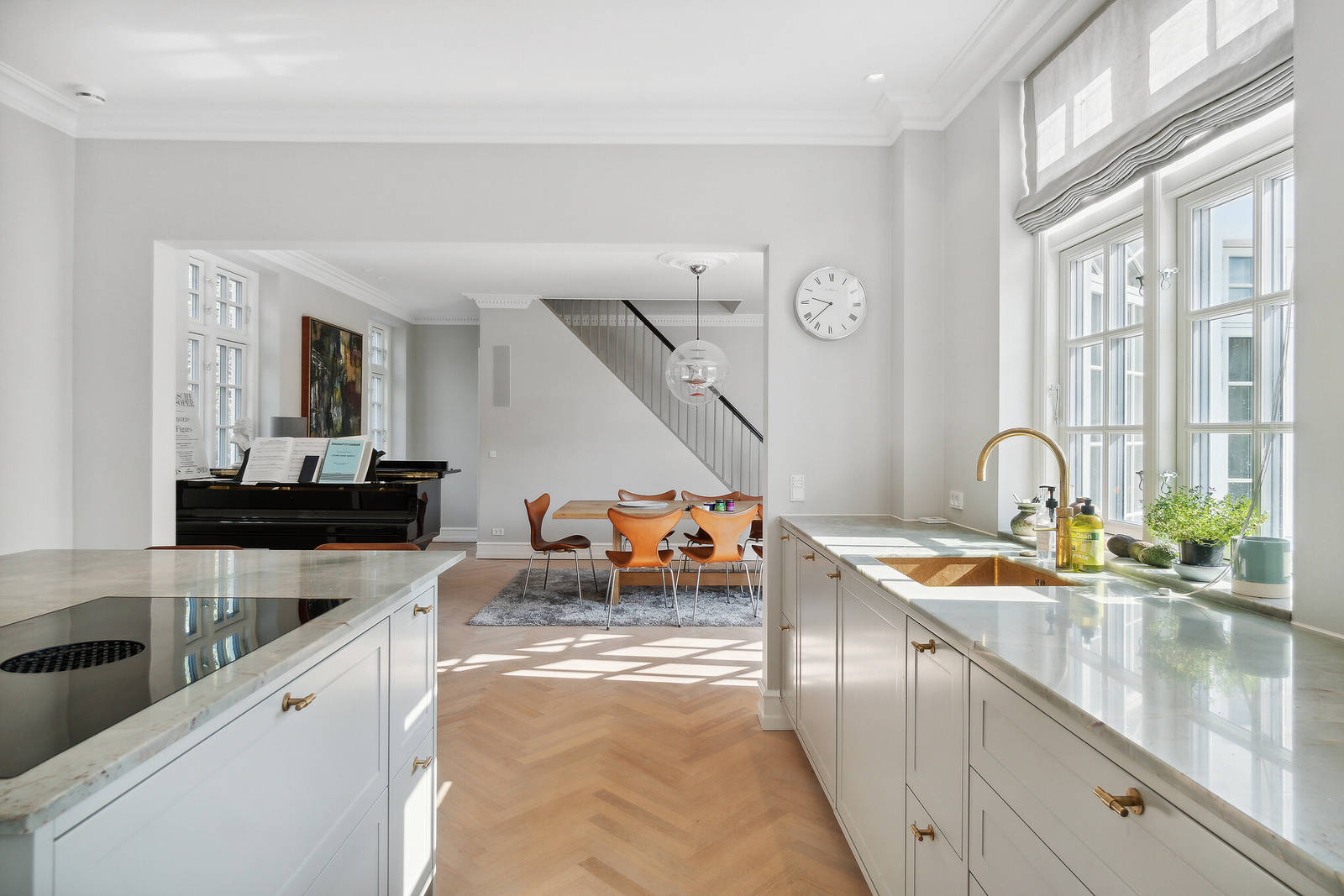 The grey Shaker kitchen goes perfectly with the style of the old Charlottenlund house, and the décor is the ideal match for the family. There is a kitchen island with a hob, wine cabinet and seating, the end wall in the kitchen exudes unparalleled functionality with tall units housing the oven, coffee-maker and fridge/freezer, and the beautiful worktop in natural J’Adore quartzite with a patinated brass sink can withstand intense daily use.