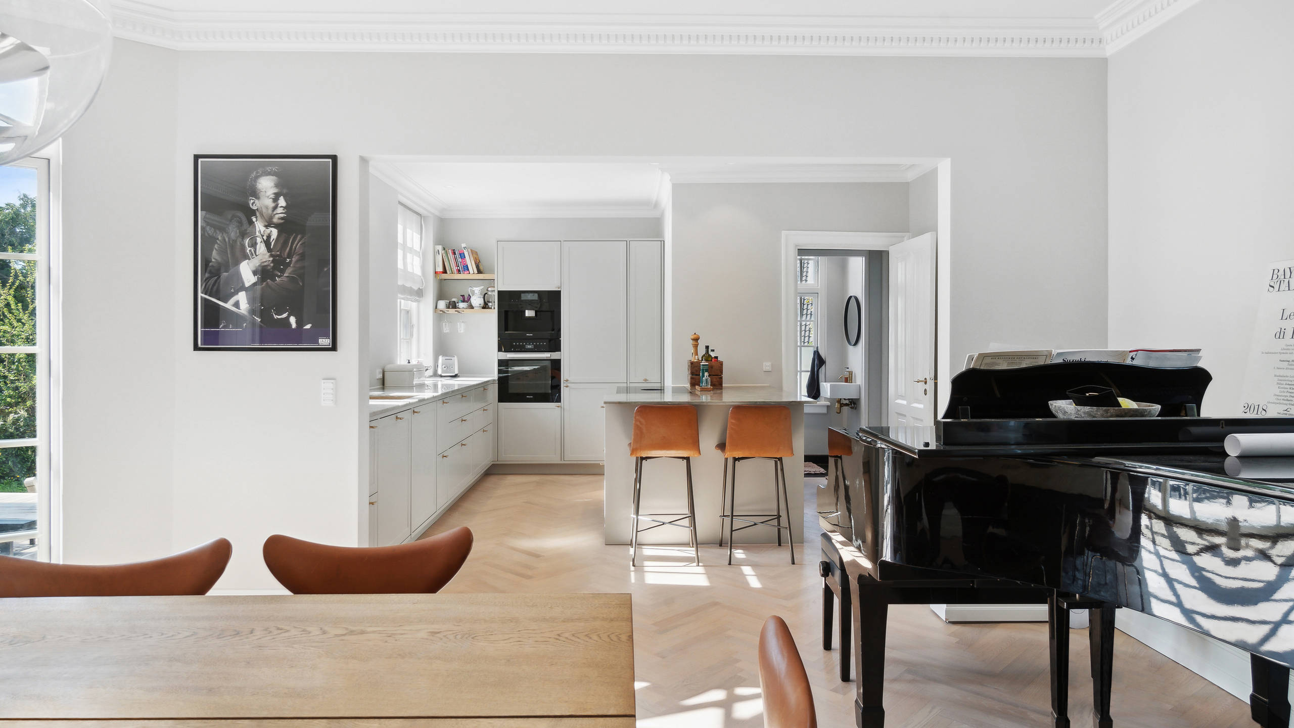“I therefore started by looking at what was possible – how to create room for tall units, space for a kitchen island with seating, and at the same time a beautiful view of the grand piano in the living room, and at the limitations imposed by the outer walls of the beautiful old house,” says Usman.