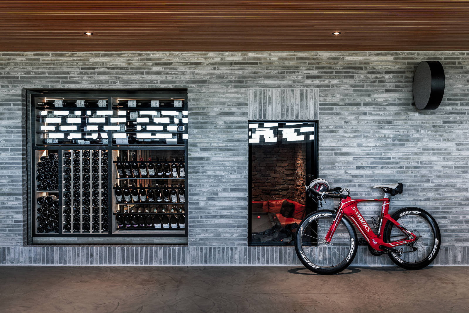 The wine collection and the gas fireplace are integrated into the wall between the sports bar and the garage, which has plenty of room for four cars, mountain bikes and surfboards.