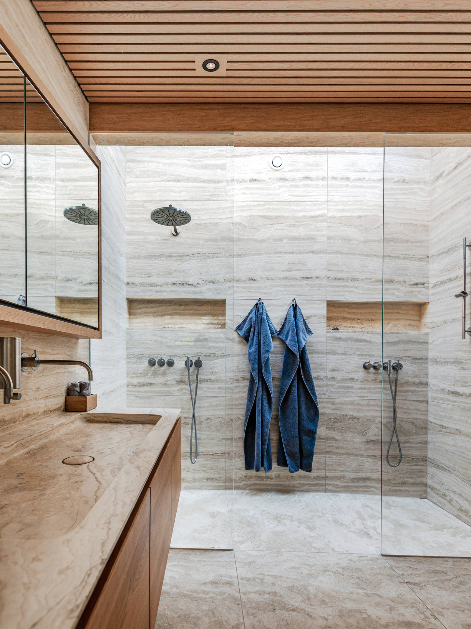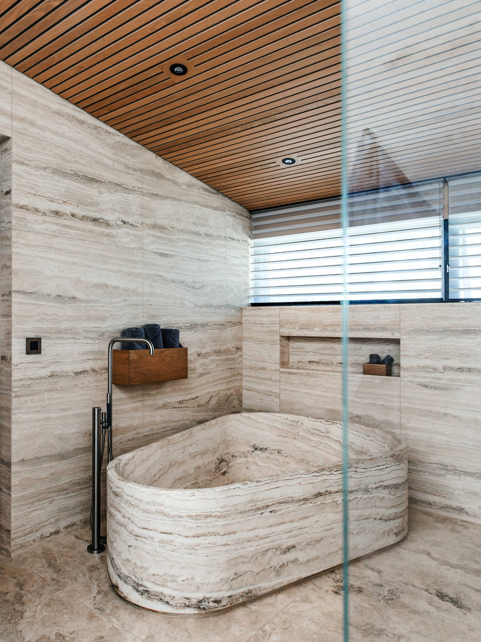 The bathrooms on the ground floor have skylights spanning the full width of the shower, creating a sense of almost bathing under a waterfall in the East. The bathtub in Allan and Mary’s bathroom is a chapter in itself – carved out of a massive block of natural stone. The same stone is used on all the walls, with matching veining on the walls, floor and countertops.