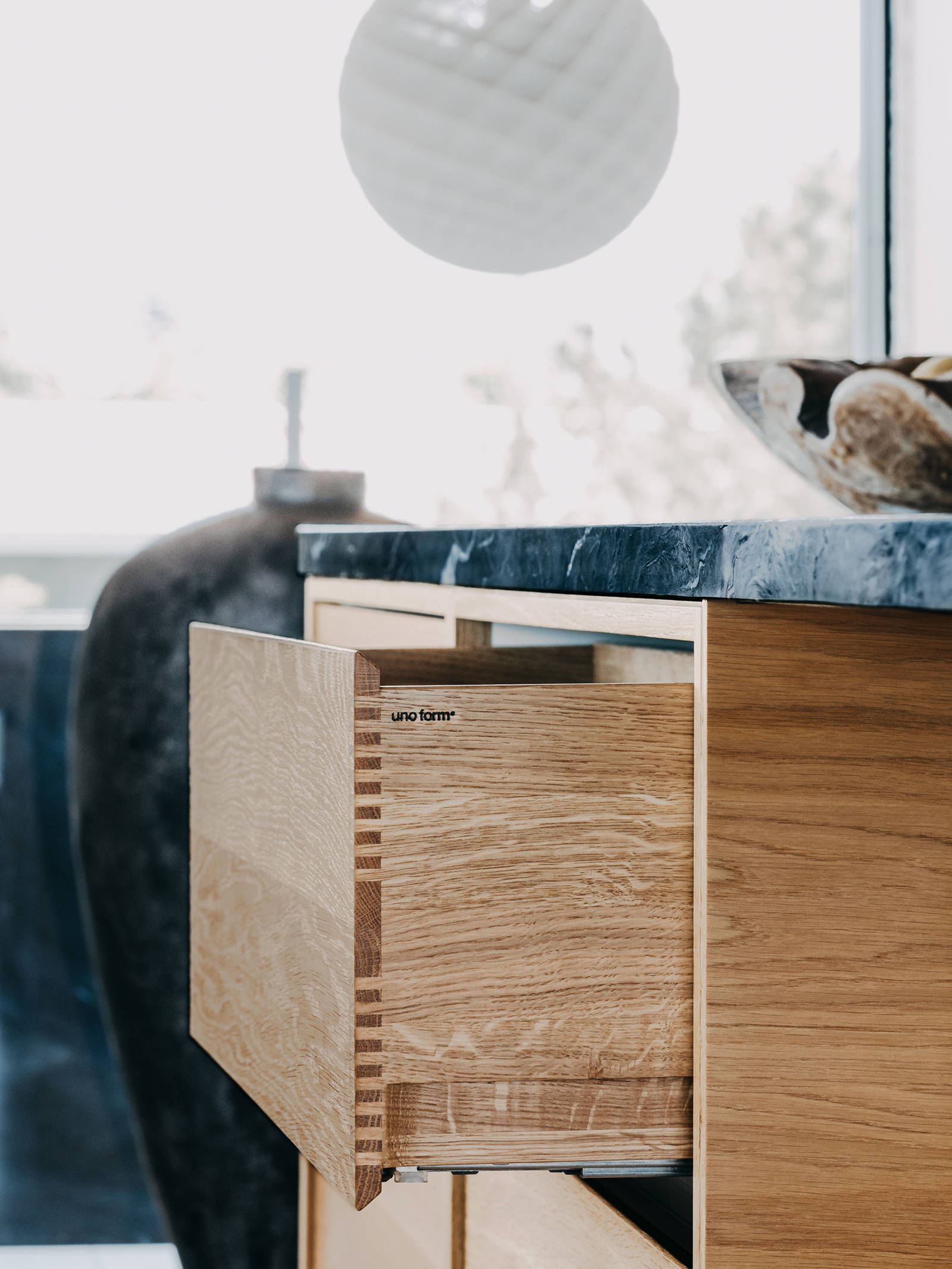 The kitchen was designed in collaboration with Anja Hagstrup from uno form Aalborg, and the modern, clear-cut look matches the rest of house perfectly.