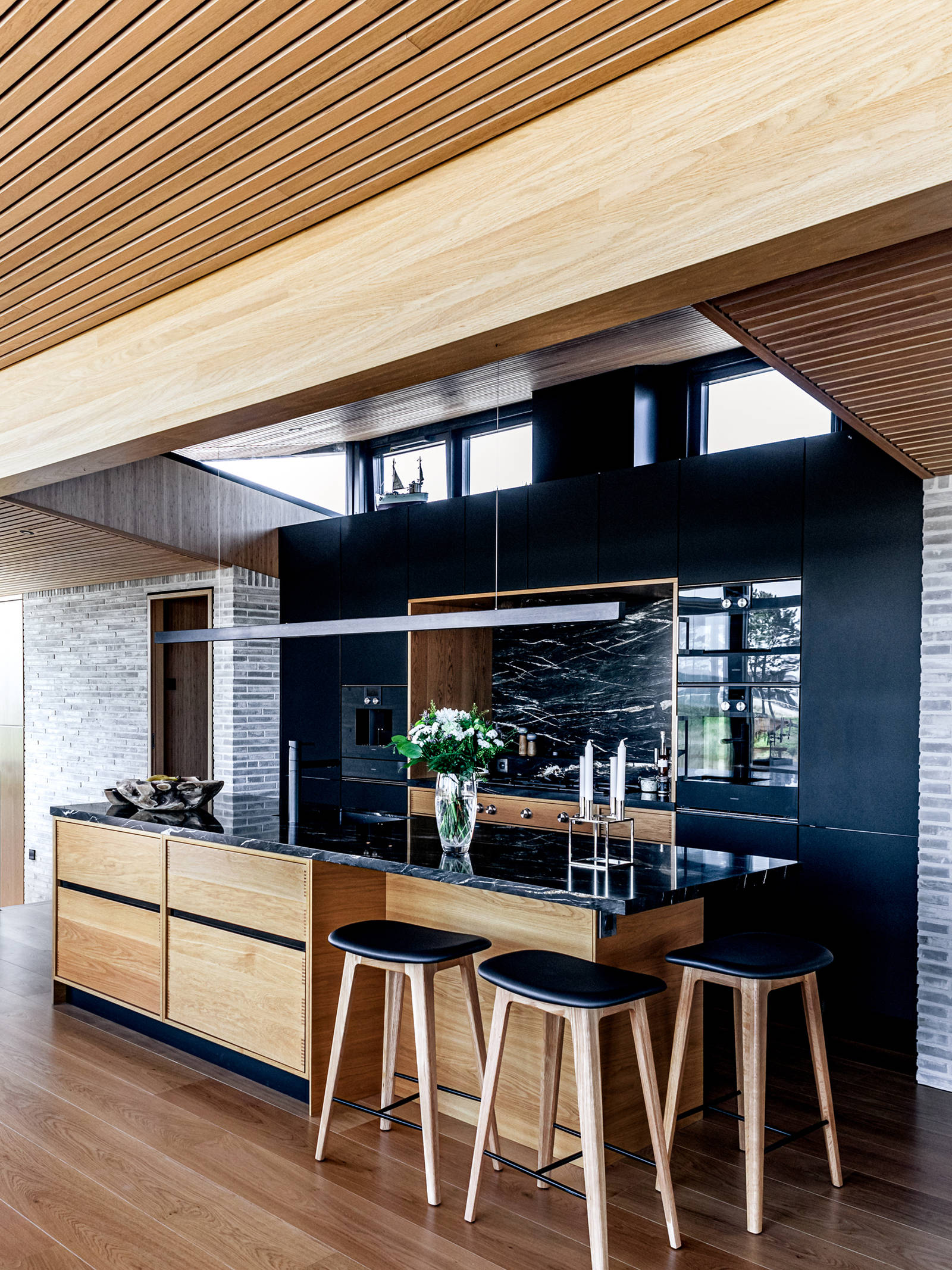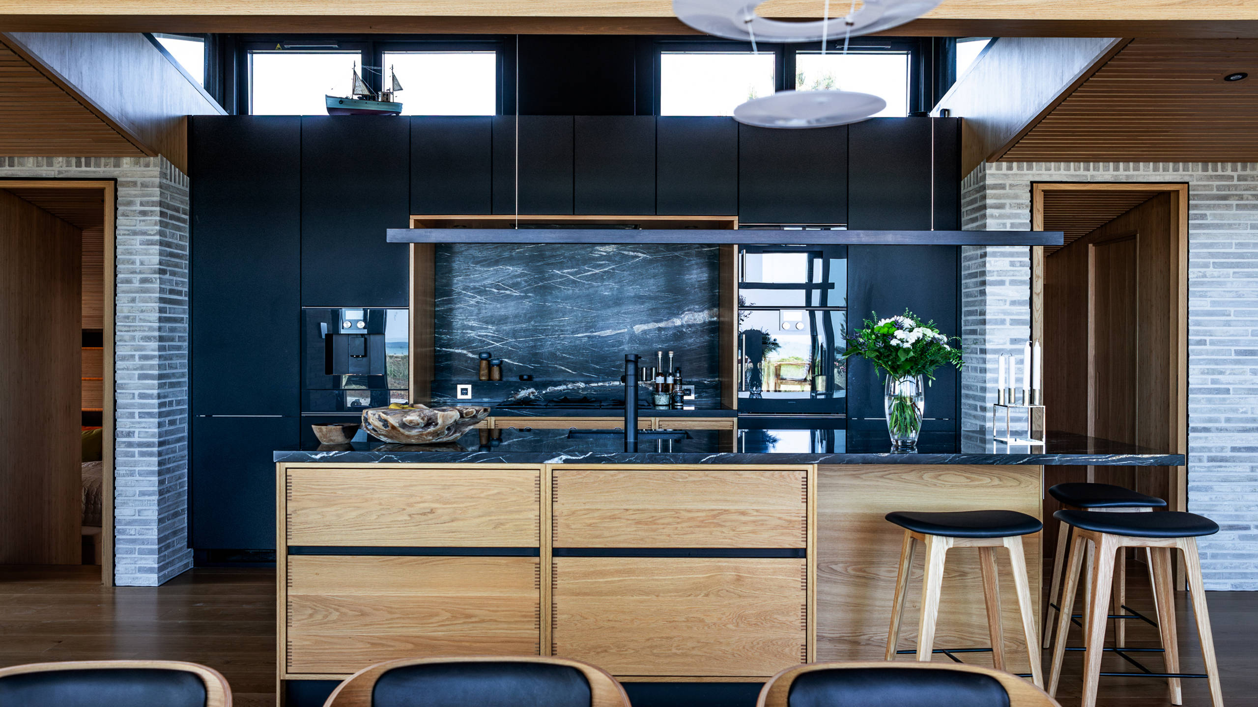 Oak features prominently in the Copenhagen bespoke kitchen from uno form, which is combined with tall units in matt black laminate and worktops in Belvedere granite. The bronze/brown tints in the veins of the dark Belvedere granite tie in well with the oak, bamboo and the natural hues of the handmade bricks.