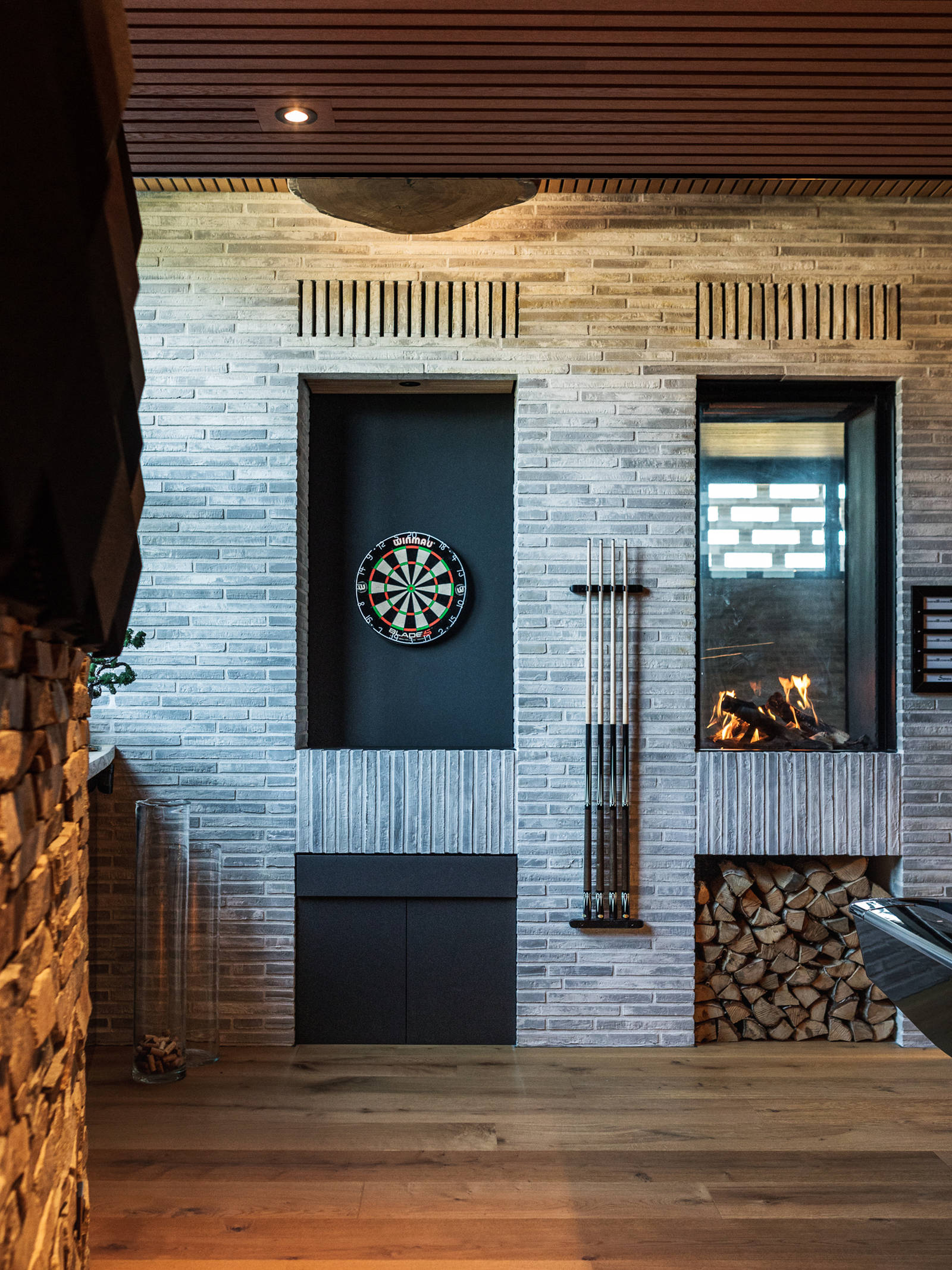 In the basement, Allan has created his own private sports bar with a billiards table, a big screen and an area for playing darts. For Allan, even the smallest detail counts, which is why a dark type of wood has been milled into the oak floor to mark the oche, or throw line, exactly 237 cm from the dartboard.