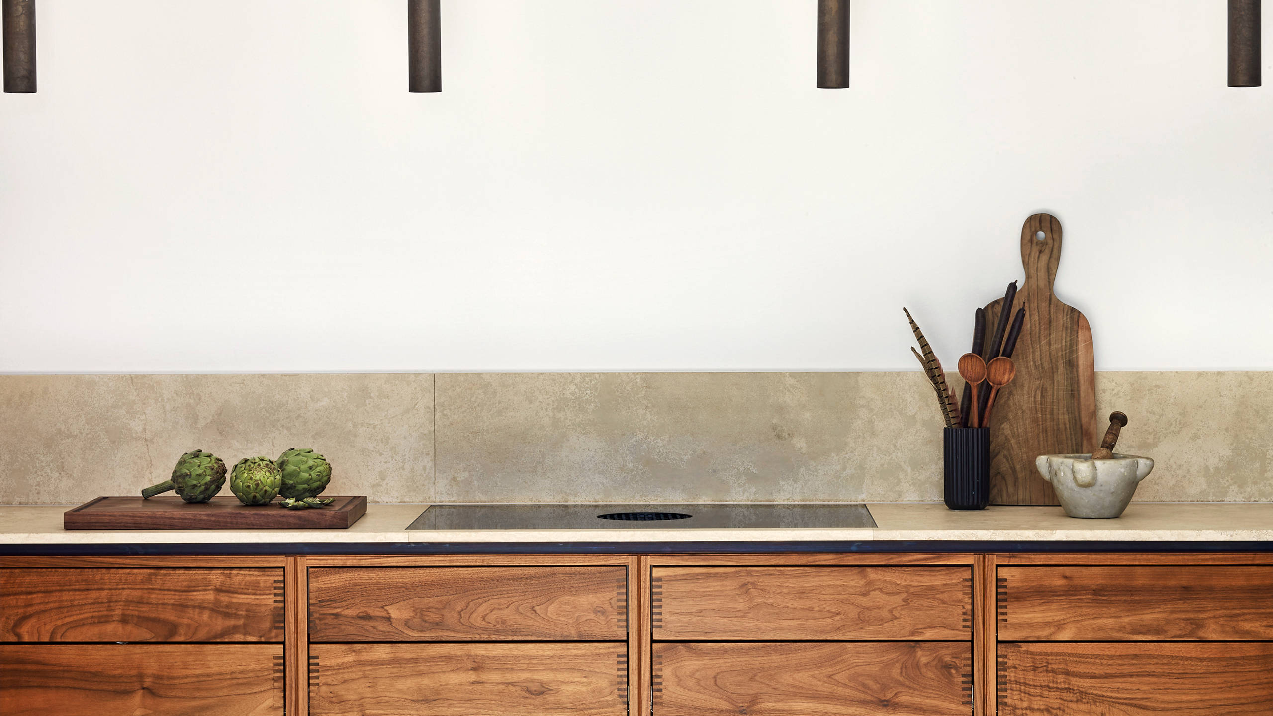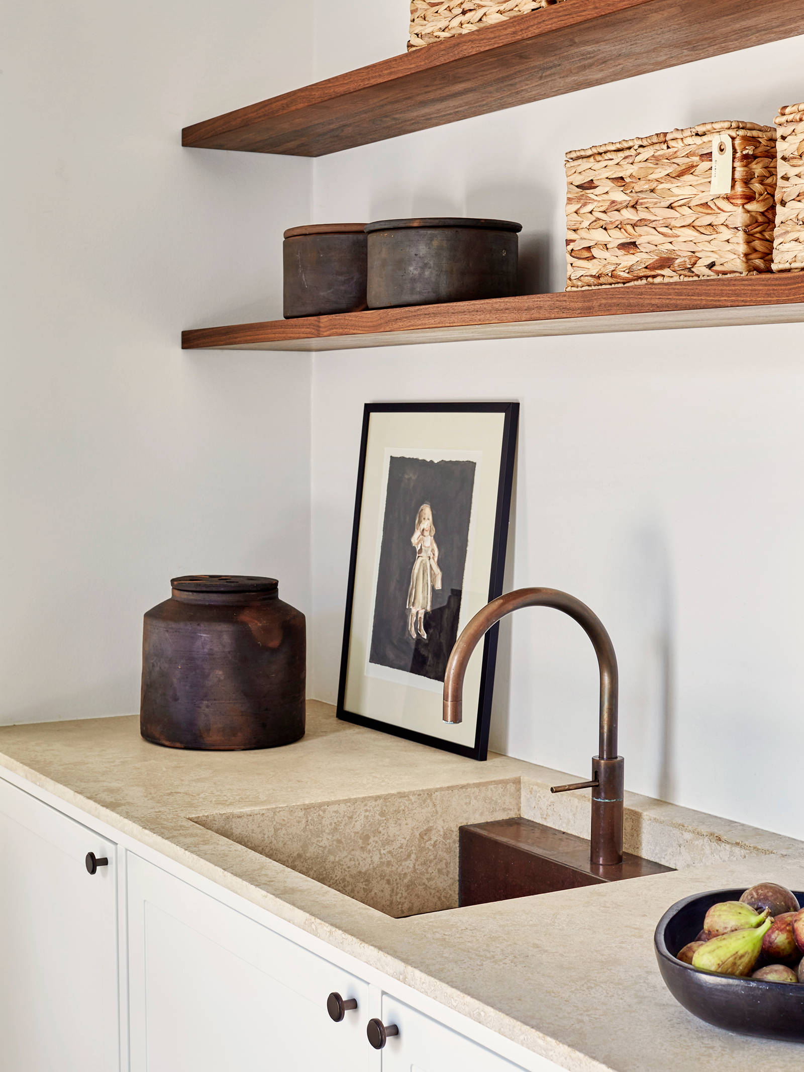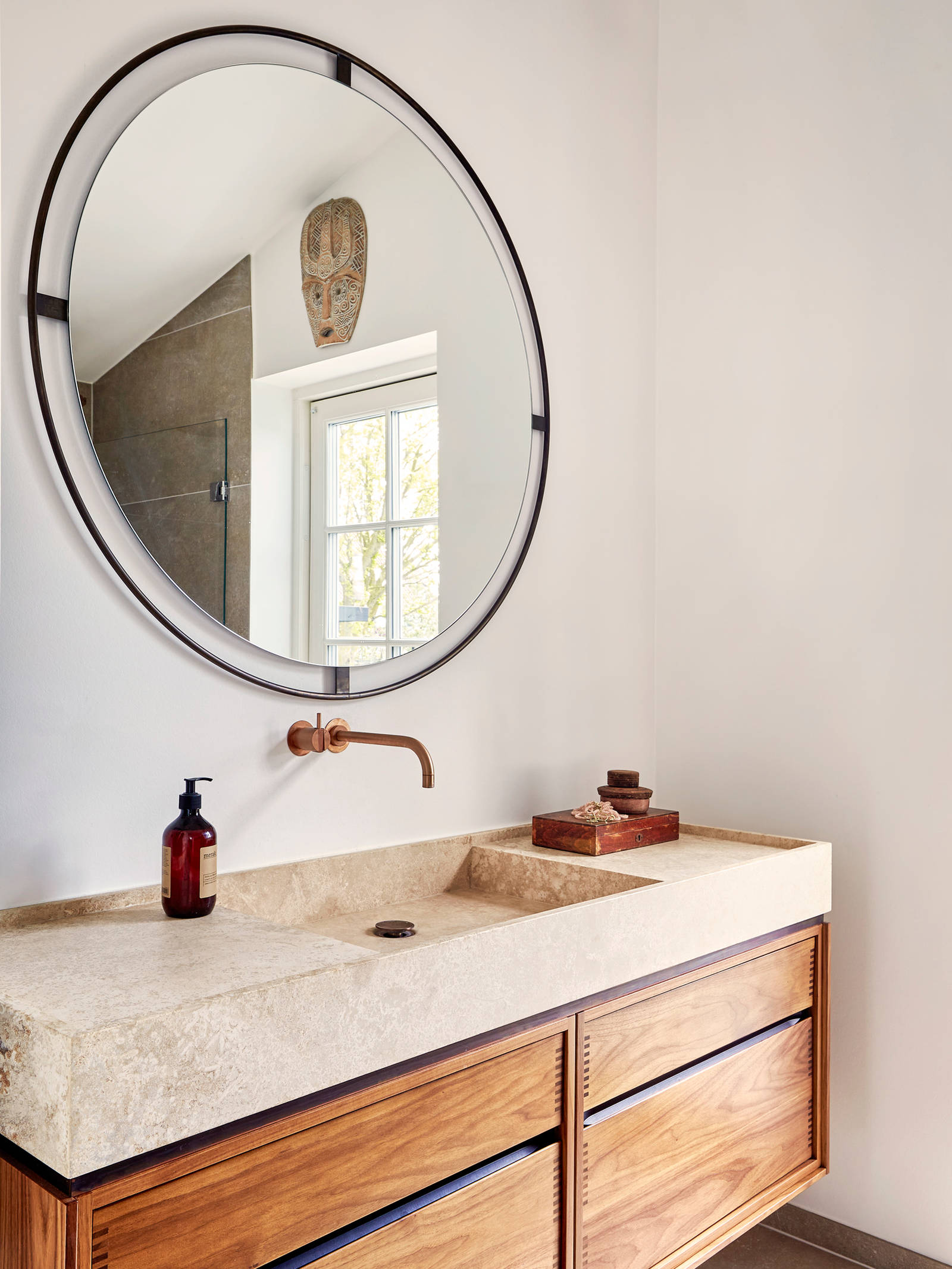 She recommended a bespoke walnut kitchen, which patinates to a beautiful golden hue matching Lis and Jesper’s furniture. The walnut wood is beautifully set off by the travertine worktops and fixtures in burnished brass and brushed copper.