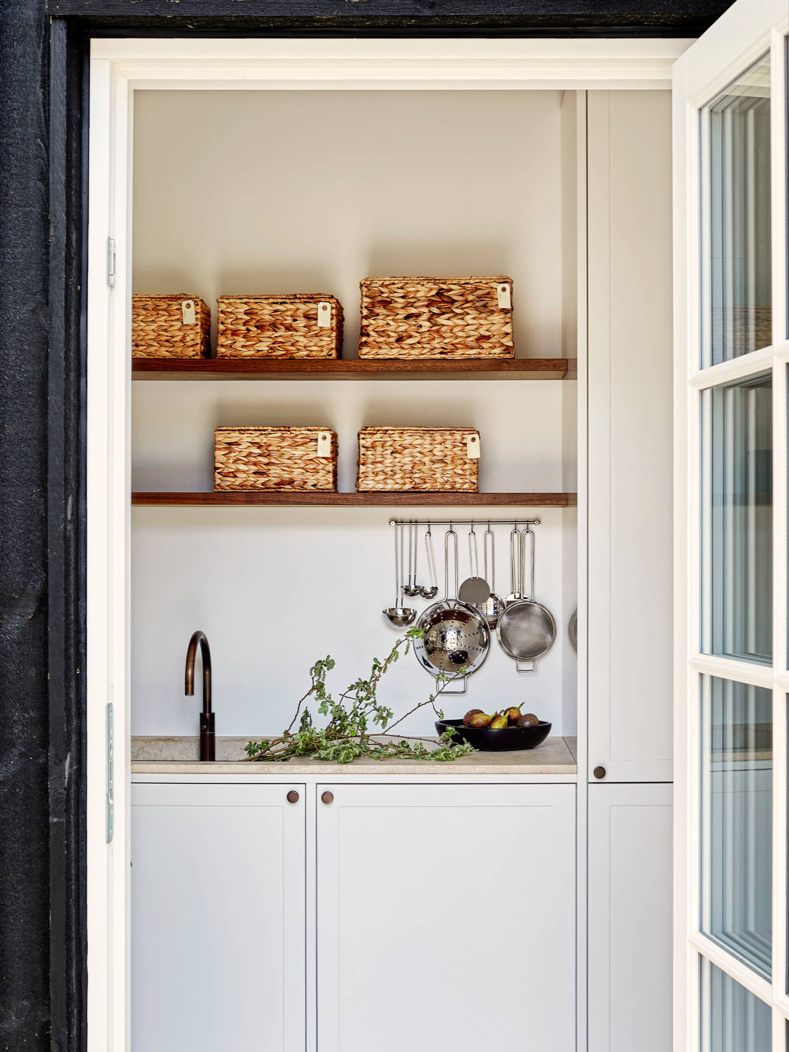 The task was to strike an aesthetic balance between maintaining lightness in the small fisherman’s house while optimising the space for storage. So the kitchen is fitted with beautiful display cabinets for wineglasses and tableware, with spacious drawers and high cabinets. The extra high drawers in the Copenhagen collection have an internal height of 34 cm, which means that even tall items can be stored standing up.