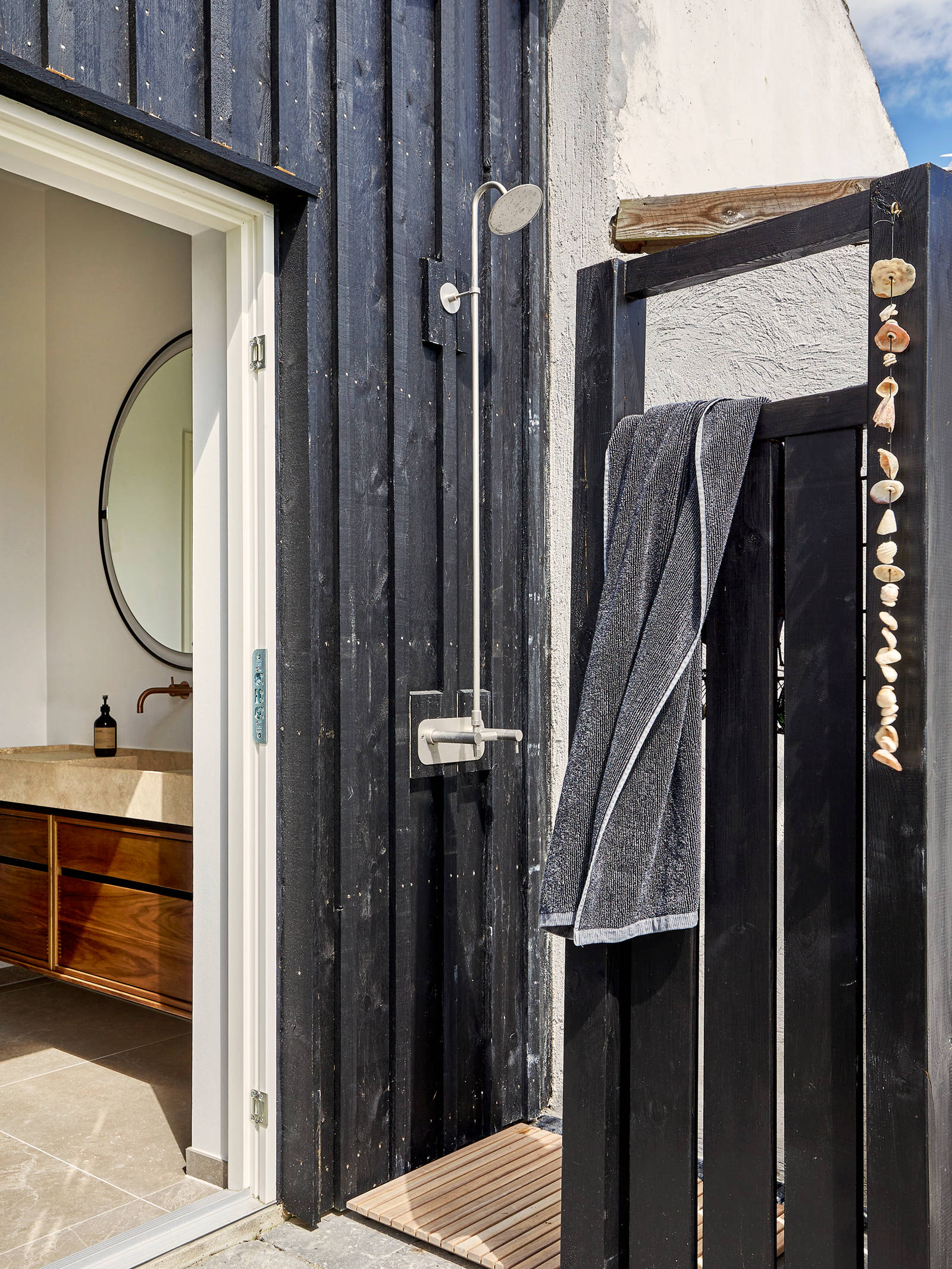 A door leads out of the bathroom into the backyard, and Jesper loves being able to take a dip in the winter from his own beach.