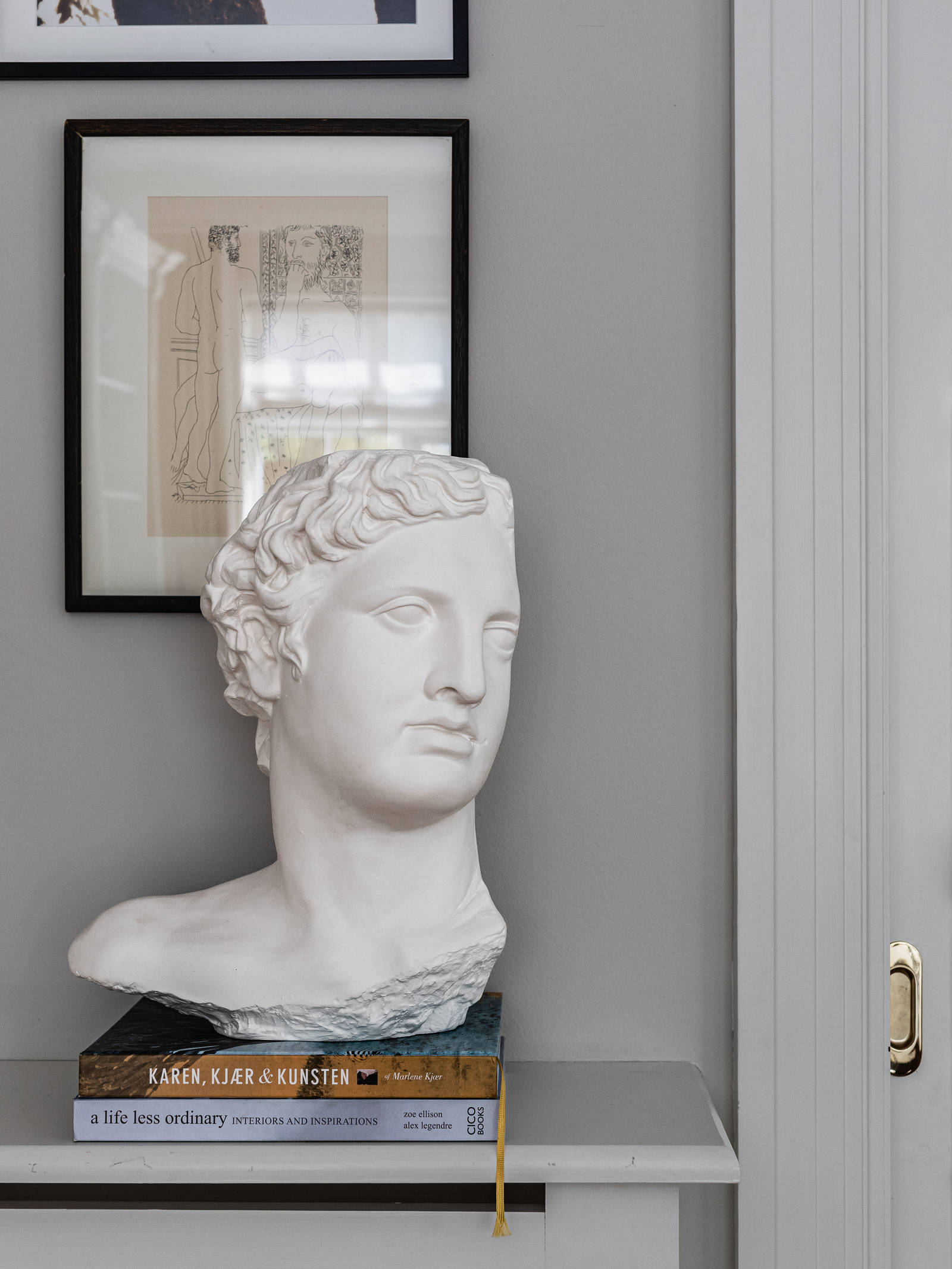 The style is bohemian luxury, and Marlene Kjær enjoys mixing and matching designer furniture with handpicked antiques found in Denmark, on journeys or when spending time in the family summer home in Nice, France. All around the house are little tableaus arranged with bric-à-brac, candles and books.